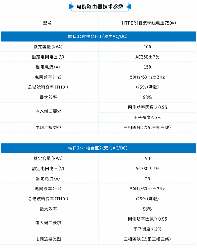 端口數量和大小可根據用戶需求定制,較大功率的電能路由器采用多模塊并聯設計,由多臺柜體組成整套電能路由器,功率范圍擴大到400kW,單端口最大功率可達500kW。