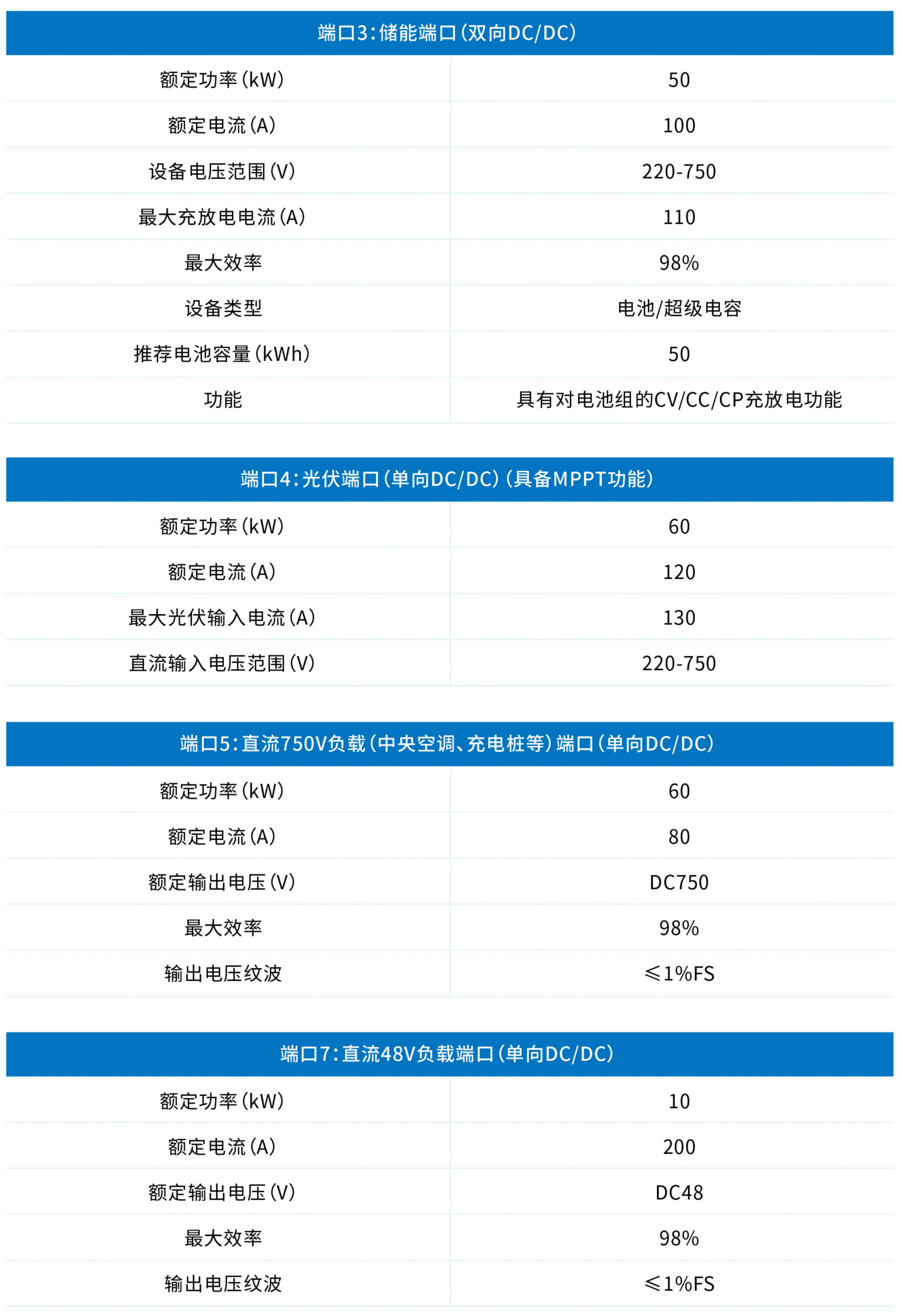 本公司生產的標準多端口電能路由器包含七個端口,其中兩個交流端口接市電或交流負載;五個直流端口分別接入儲能、光伏和三種電壓的直流負載,每個端口均可接入相應電壓等級的有源或無源設備,任意端口間可以實現功率潮流的控制。