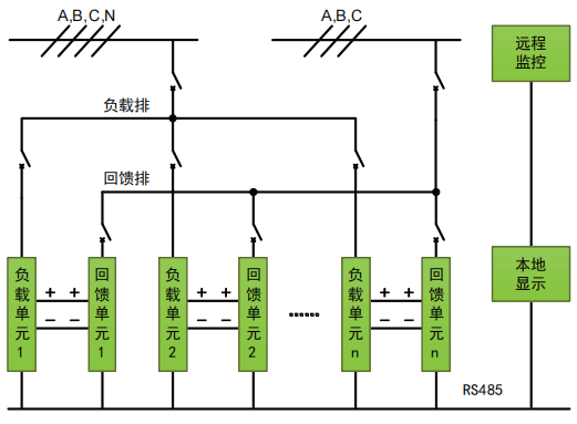人機(jī)界面通過(guò)RS485總線集中監(jiān)控管理負(fù)載單元、回饋單元,模擬小電流負(fù)載時(shí),可運(yùn)行一個(gè)負(fù)載回饋對(duì),模擬大電流負(fù)載時(shí),可運(yùn)行多個(gè)負(fù)載回饋對(duì)。每個(gè)負(fù)載回饋對(duì)又可以單獨(dú)調(diào)節(jié)輸出電流的大小,以達(dá)到精確輸出的要求。