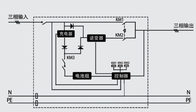 說明:設(shè)備內(nèi)部由逆變器、充電器、電池組、控制器、切換器件KM1、KM2、KM3等構(gòu)成。