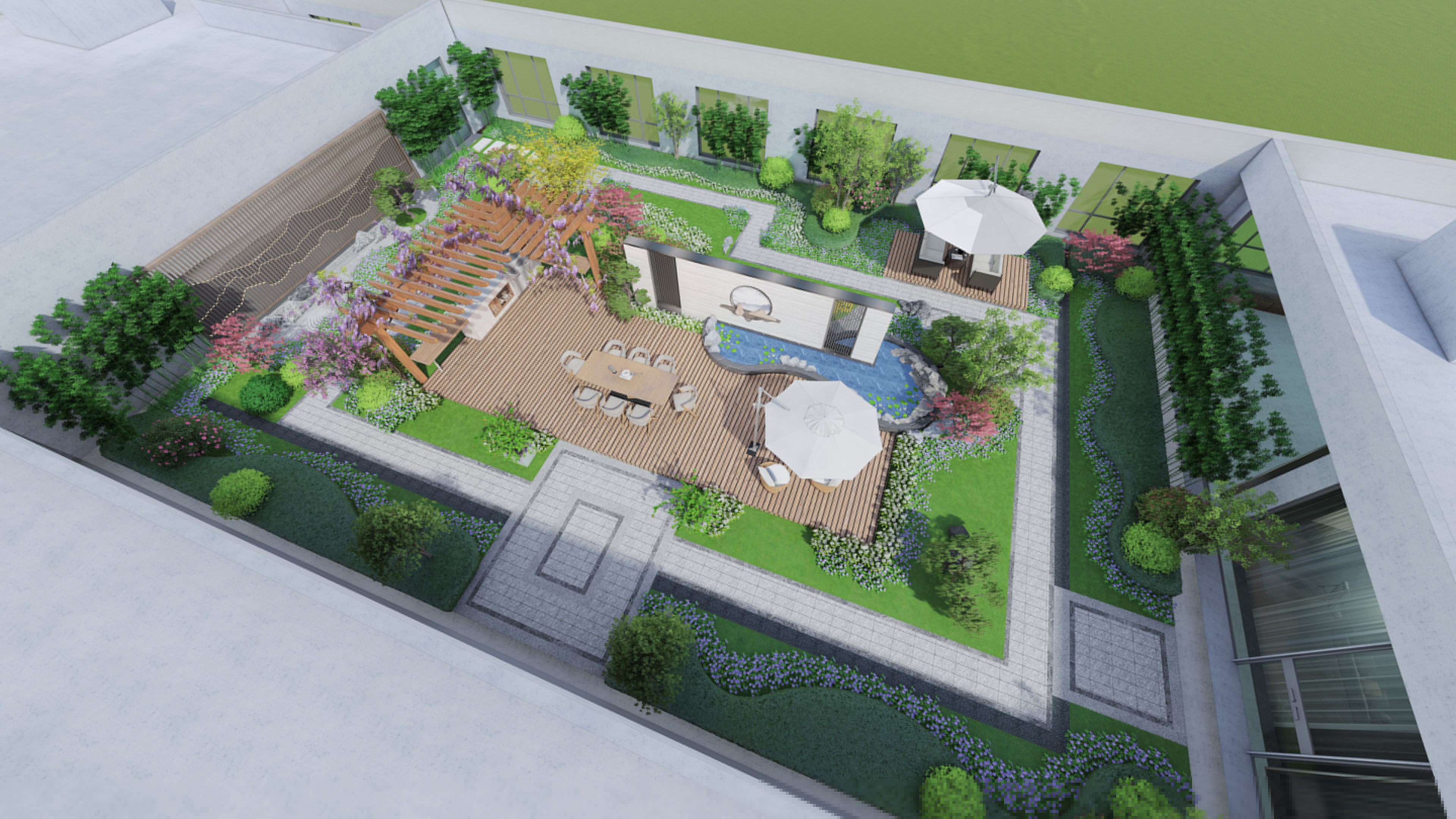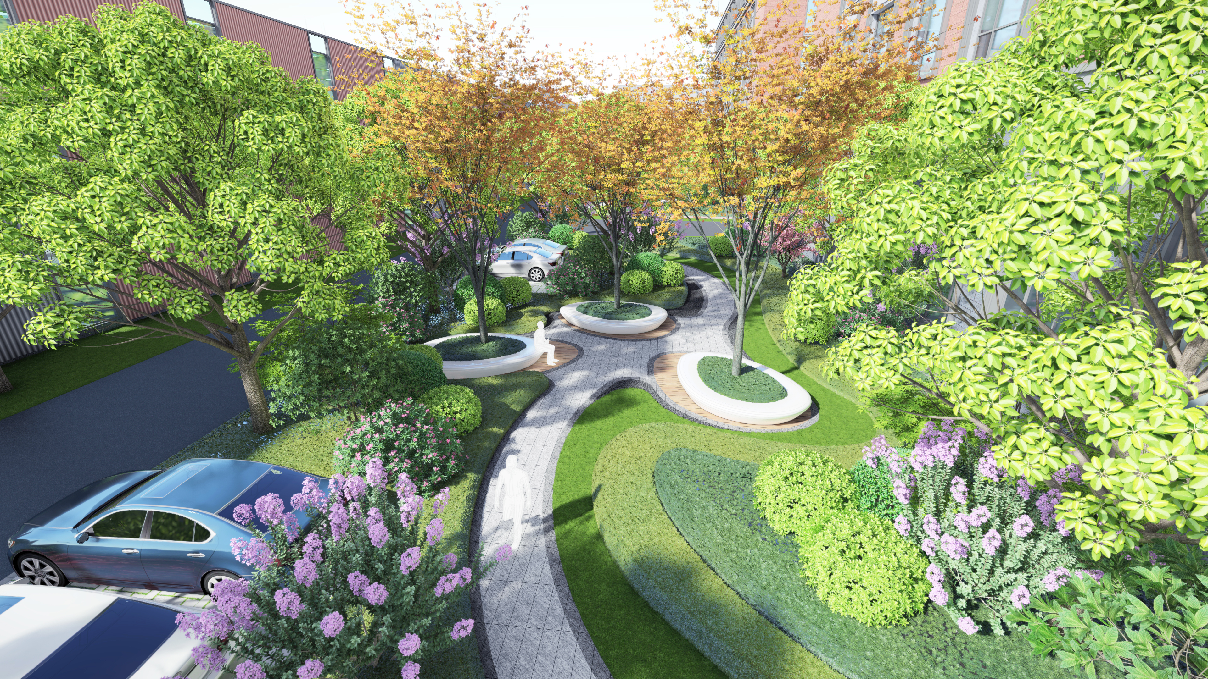 配套建設的近1萬平方米地下車庫,凈高3.05-3.20米,設計有高檔環氧自流坪地面,車流標線明晰。地下空間透過玻璃幕墻與園區下沉綠色廣場景觀無障礙對接,車庫清新明亮。